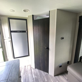 The 212FB is an open floorplan concept that can sleep 2-4. It has a walk-around queen bed in addition to a full pull-out bed in the sofa. The kitchen includes a microwave, three burners, an oven, and an 8 cu-ft RV fridge. The sink is nice and big with a pull-out sprayer to make doing dishes easy. It has no carpet installed and tons of storage inside!